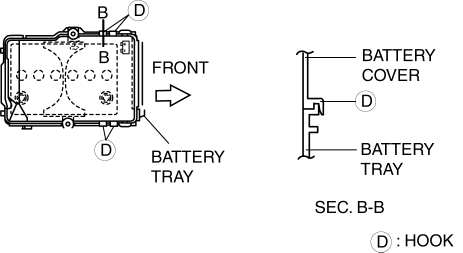 2. Install with battery cover hooks D aligned with the battery tray flange at four points.
