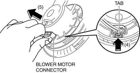 13. Press the tab (4) and disconnect the blower motor connector as shown in the figure (5).