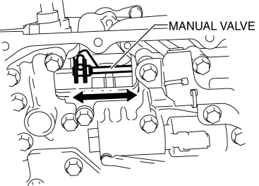 4. Stroke the manual valve in the direction of the arrow to verify that the manual valve is correctly engaged with the parking assist lever component.