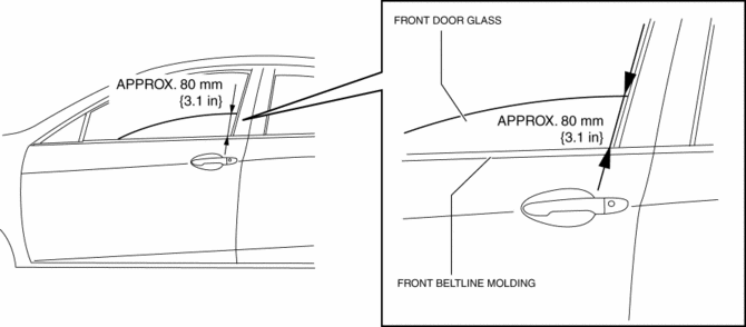 1. To access the glass installation bolt, position the front door glass so that the distance from the top of the front door glass to the upper part of the front beltline molding is approx. 80 mm {3.1 in}