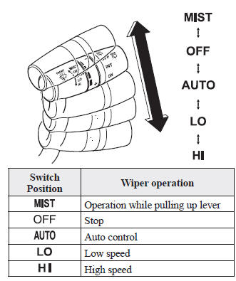 However, if the wipers cannot remove this ice, dirt or foreign matter, the autowiper control will stop operation. In this case, set the wiper lever to the low speed position or high speed position for manual operation, or remove the ice, dirt or foreign matter by hand to restore the auto-wiper operation.